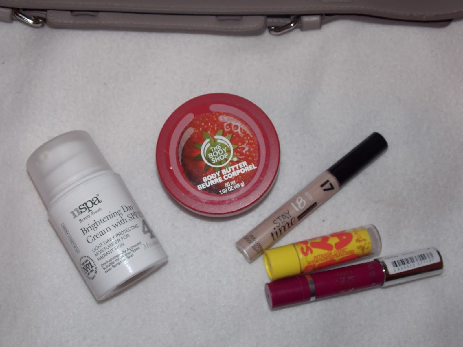 If I am wearing makeup on a day off, rather than take my makeup bag I just take my 17 concealer for touch ups and a lipgloss, L'Oreal Glam Shine Dare The Dragon Fruit being my go to at the minute. I carry a mini Body Shop Strawberry Body Butter, because I love the smell, but also at work sometimes I use it after the many many many times I wash my hands. I take a bottle of my Victoria Secrets body spray for a quick spritz of freshness for work, I'm not as obsessed with these as every one else seems to be, I find them very sweet but a quick spritz is enough for me and truth be told I want to use them up. Waste not Want not as the old saying goes.