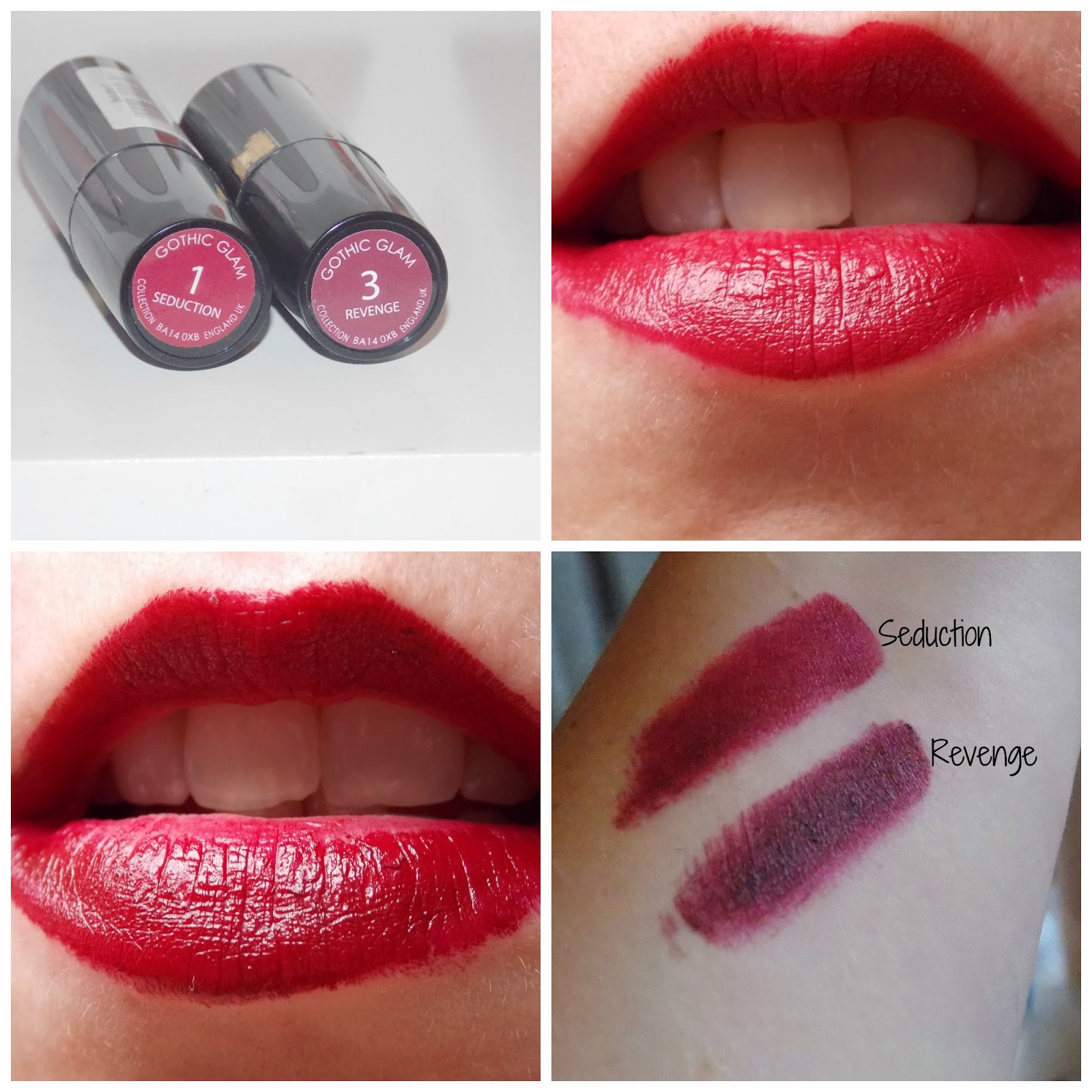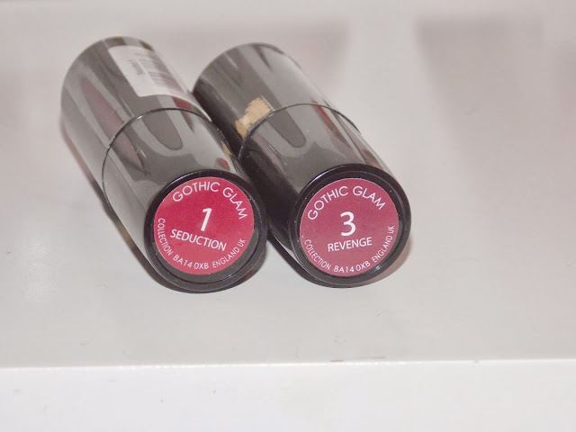 I have always been one for more nude/pink lip colours but the adventurous side in me has been unleashed and I am finding myself browsing the darker side of the lipsticks when in Boots..I spotted the Gothic Glam Collection which consists of three 'Gothic' dark vampy shades of lipstick Seduction, Revenge and Scorned available in Superdrug for £2.99 (also in Boots but can't seem to find a link).
