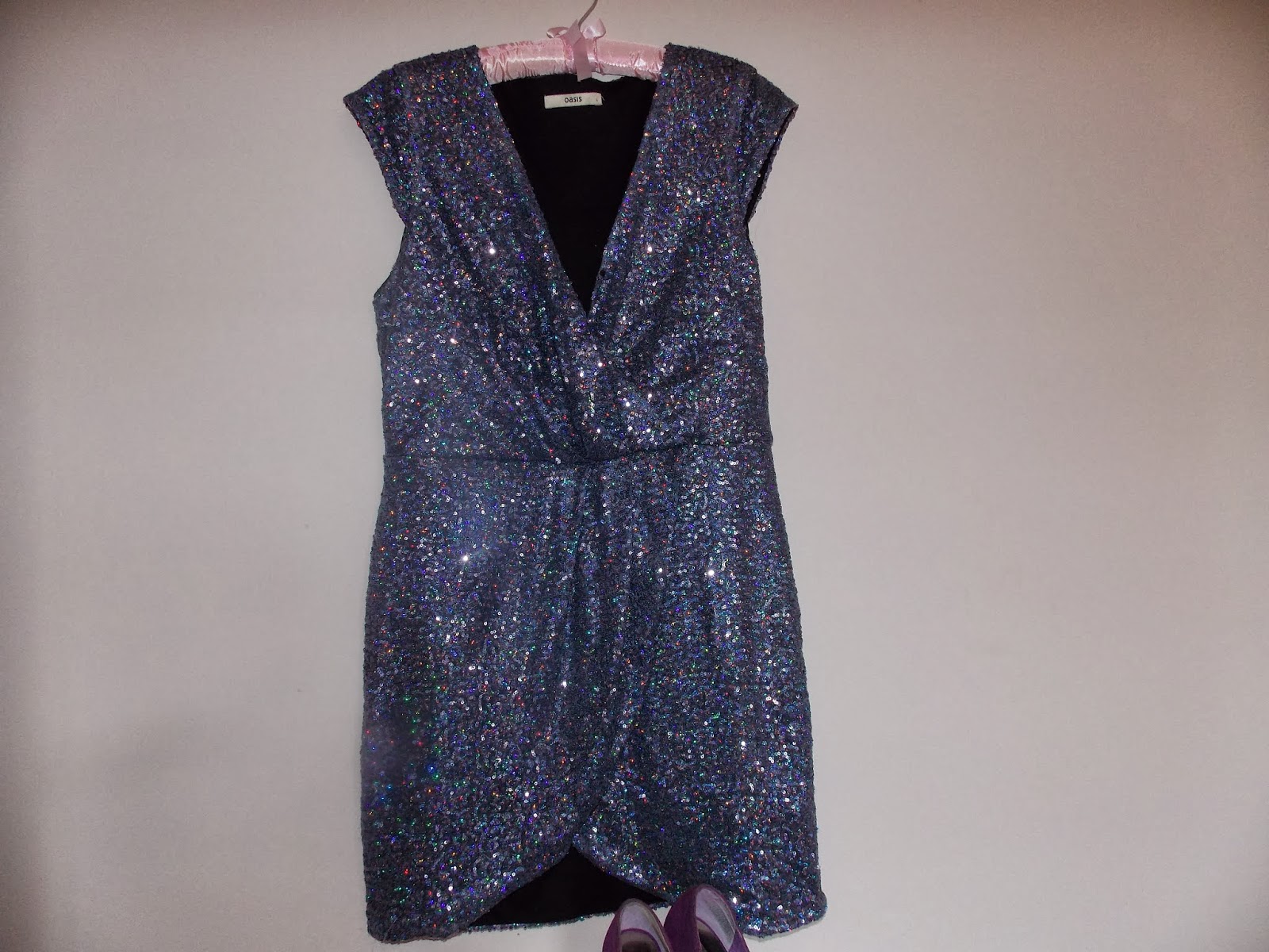 By now I think everyone knows I love anything sparkly or glittery so it's no surprise that my outfit would have both! I wasn't too sure about this dress from Oasis ( which is now on Sale-I knew I should have waited!) but the more I try it on I love it-it is such a flattering fit and I just love the sparkles. I was not fussed on the colour at first but I actually really like it now, a blue/purple shade that reflects the light. It has a wrap over dress feel to it which is really flattering on the bust and legs plus I think I can get plenty of wear by teaming it with tights on later outings. I have paired the dress with my trusty Primark shoes which have a lovely Brooch type detailing of gems and feathers (nobody ever believes me when I say these are from Primark-I have to actually take them off to show the label!) Personally I think these shoes do look more expensive than Primark and I really love them-I have had them for a good 2-3 years and they are still going strong!